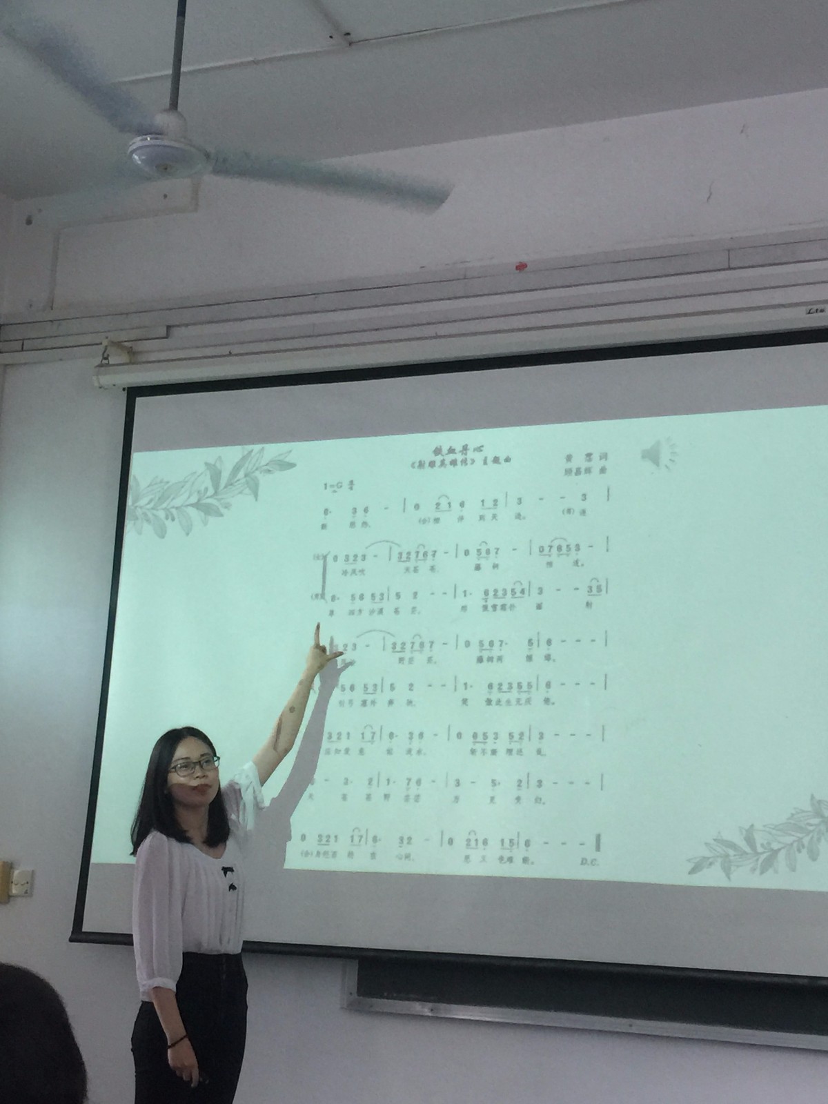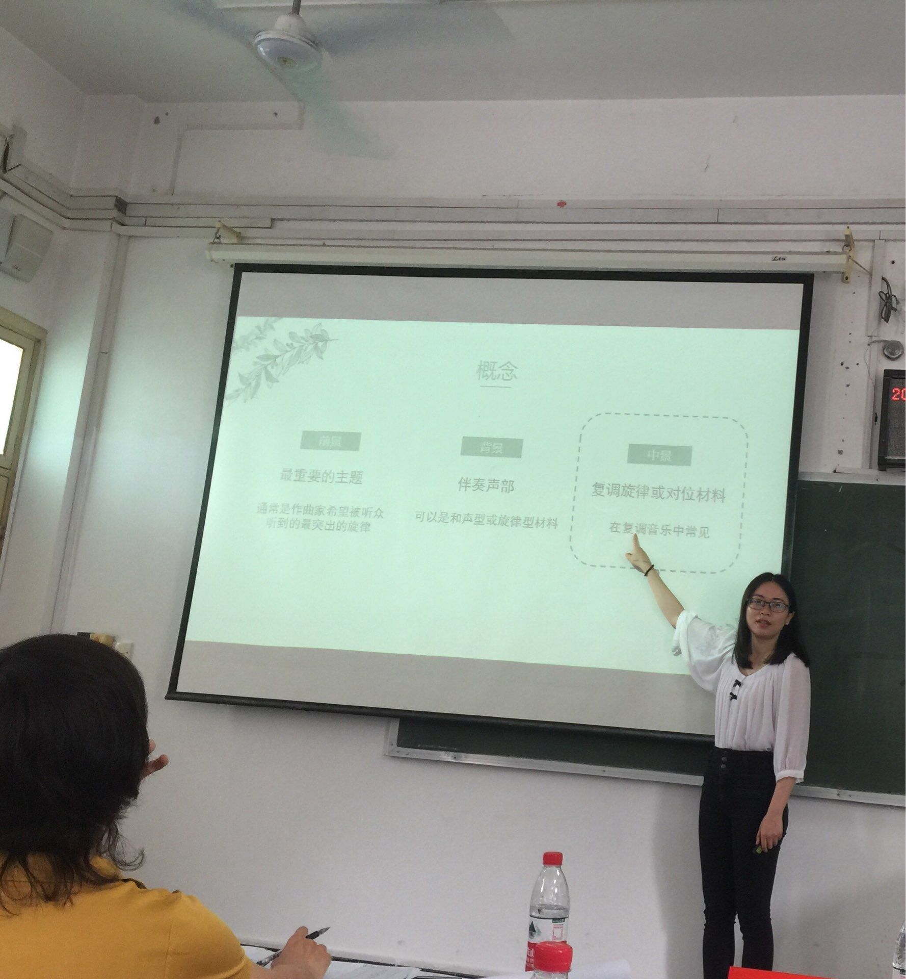 在此次竞赛中,我院陈柳娇老师选择的讲课内容为《音乐中的前景-中景-背景》,课程导入从画面给人呈现出的视觉层次感获取灵感。讲课伊始,从耳熟能详的小提琴协奏曲《梁祝》入手,通过分析其前景中景的音色处理,及背景的弱化处理,由浅入深,非常形象地阐明配器的思路及重要性。在讲课过程中,在设置的演唱和角色扮演的环节中,与现场老师和同学们积极互动,点燃了现场的气氛。