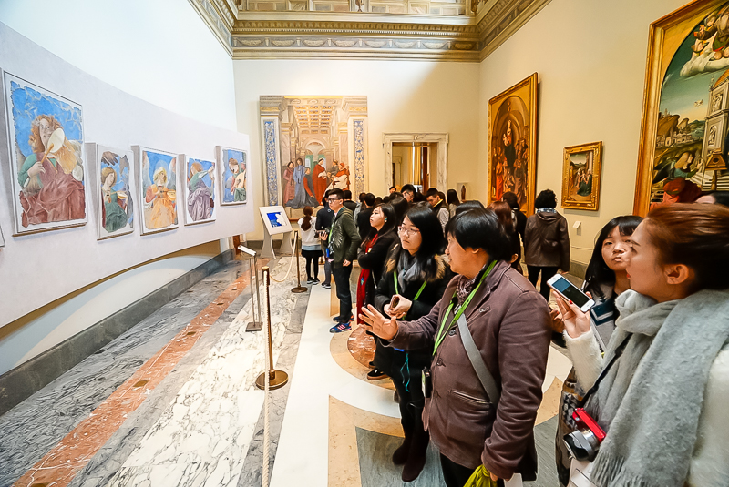 马林老师首先针对博物馆的油画作品,从绘画艺术的宗教、文化、风格等多个方面为访学团进行讲解。在谈到拉斐尔时,他认为:“拉斐尔的作品《耶稣显灵》较能体现拜占庭到文艺复兴时期的空间维度变化,虚实关系的转变,从缺乏人性没有动态到后面的充满人文情怀,其在西方艺术史上亦占有重要地位”。此后,欧洲访学团又参观了波提切利、提香、达芬奇以及贝里尼等名师的作品,在马林老师的讲解下,对博物馆内的油画作品有了进一步的了解。