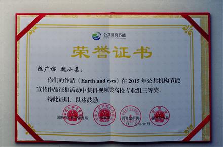 我院代表学校参加2015年公共机构节能宣传作品征集活动,获评“优秀组织奖”,研究生陈广榕、魏小嘉的作品《Earth and Eyes》获得视频类高校组三等奖。本届大赛由由国家机关事务管理局、教育部、团中央、国家粮食局联合举办,涉及节水、节电、节粮以及节能环保等主题。