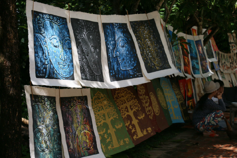 夜幕落下,我们收起画具去觅食。南洋法式的街灯发出幽暗的光,映罩出芭蕉树影影绰绰的身形,晚风扬来,带走湿热,传来一阵簌簌声。随人流涌向琅勃拉邦夜市,入眼先是一批当地风情服饰的地摊,老挝语,中文,英语招呼着来往的每一个人。挑挑看看后拐角进入美食一条街,空气中传来芒果波罗蜜、烤鱼腊肠、洋葱薄荷味......也不必什么美食攻略,看见什么中意就吃什么。与中午在餐厅用餐的体验完全不同,这时我们不是坐在高椅上的旁观者,而像一个个普通的当地人,随喜自安。