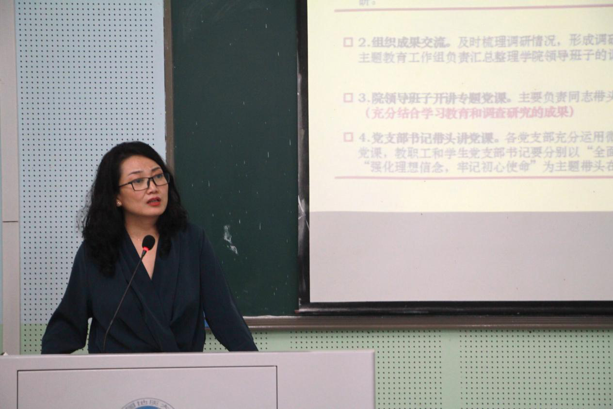 “不忘初心、牢记使命”主题教育的工作计划。郭秀蓉强调本次主题教育活动要聚焦主题,深入学习贯彻习近平新时代中国特色主义思想,加深对习总书记关于主题教育以及高等教育的重要论述的理解,同时在整个教育过程中突出问题导向,要求党员同志结合“自己找、群众提、集体议、上级点”深入查找问题,领导干部要树立一线规则,深入教学科研一线发现问题。此外,主题教育要做到贯穿结合。此次的主题教育活动由四项重要措施组成,这四项措施必须贯穿始终,广大党员既要注意将学习教育活动与庆祝新中国成立70周年结合起来,更要与学院事业发展结合起来,紧扣立德树人的根本任务,聚焦贯彻落实习近平新时代中国特色社会主义思想和习近平总书记关于教育中的重要讲话和精神,着力整改一系列问题。紧接着郭秀蓉从前期准备、学习教育、调查研究、检视问题、整改落实、成效评估及组织领导几个方面对主题教育的工作内容一一进行了讲解。最后郭秀蓉表示在学校主题教育工作第三指导组的指导下,学院的主题教育活动一定能够做到规定动作到位、自选动作创新,从而真正达到推进学院事业发展的目的。