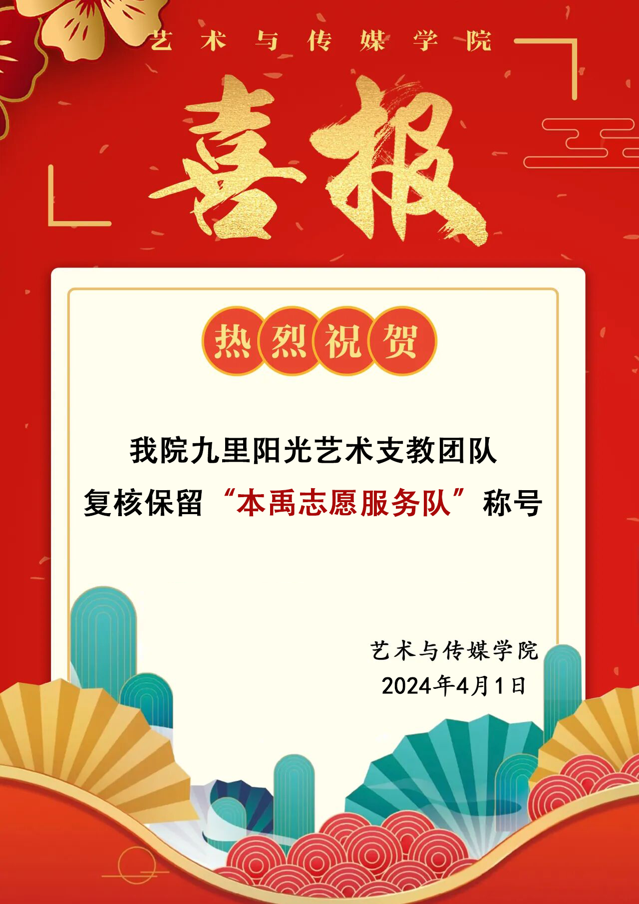 近日,湖北省志愿者协会下发《湖北省“本禹志愿服务队”2023年度拟命名和2014—2022年度复核拟保留命名名单公示》。根据评审结果,拟命名2023年度湖北省“本禹志愿服务队”50支,2014—2022年度复核拟保留命名湖北省“本禹志愿服务队”150支。我院九里阳光艺术支教团队经复核保留湖北省“本禹志愿服务队”称号。