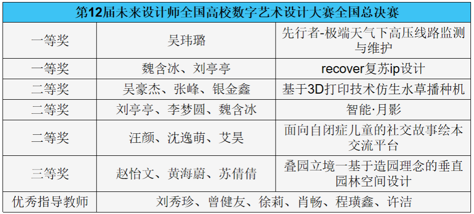 师生凭借创意与设计实力,斩获十余项奖项。其中,学生作品荣获一等奖2项,二等奖3项,三等奖1项;同时我院6位教师荣获优秀指导教师奖。