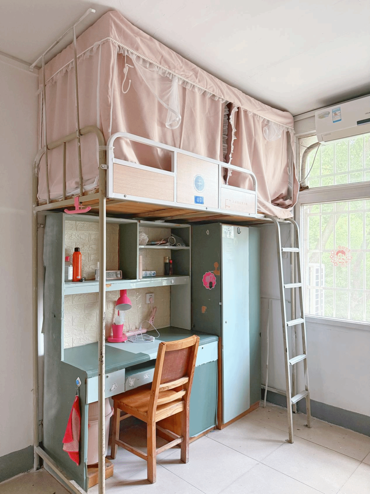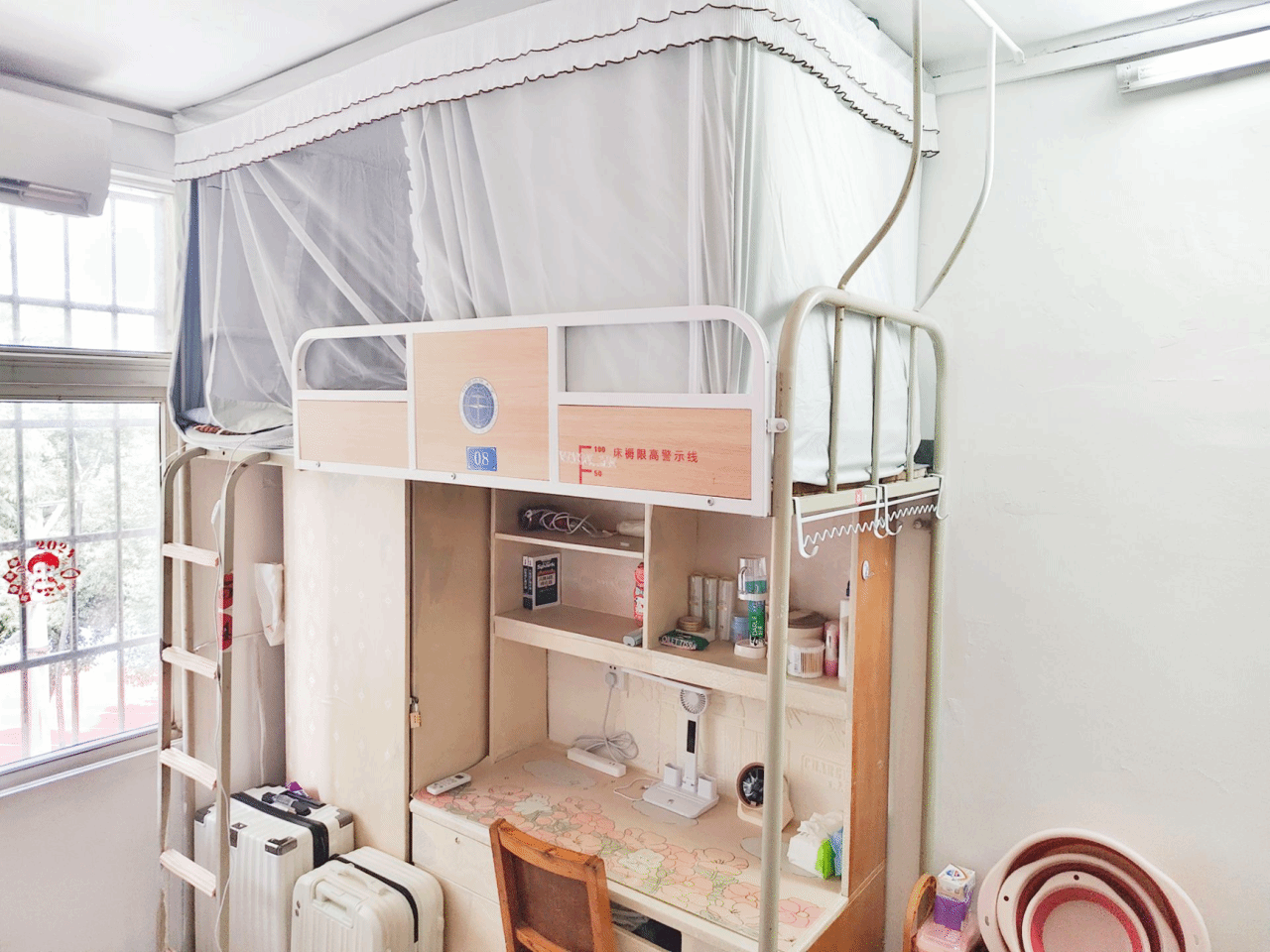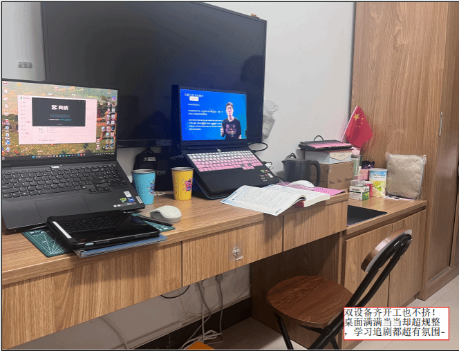 学习从来不是孤独的跋涉。在悦宾楼6217,我们看到了一幅 “学伴同行”的温馨画面:桌上并排摆放的两台电脑,常常同步播放着网课,室友们并肩而坐,随时交流、答疑解惑,让艰难的知识点在与同伴的讨论中变得清晰。而在床铺区,柔软舒适的床品自带“可爱buff”,花纹被单与贴心的小床头柜营造出放松的休憩氛围。尤为用心的是,床头贴着一张清晰的日程表,时刻提醒着学习进度。在这里,高效的学习协作与高质量的睡眠休息得到了完美平衡,躺下是满格的幸福感,起身是充沛的学习力。
